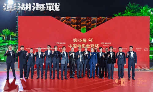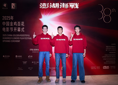 于厦门举行的第38届中国电影金鸡奖闭幕红毯上,电影《澎湖海战》一众主创统一身着黑色西装,佩戴着“澎湖海战定制版”徽章,其船帆上的红色“统”字格外醒目。拍照环节中,影片众主创目光坚定,集体比出“1”字手势,紧扣影片主题。